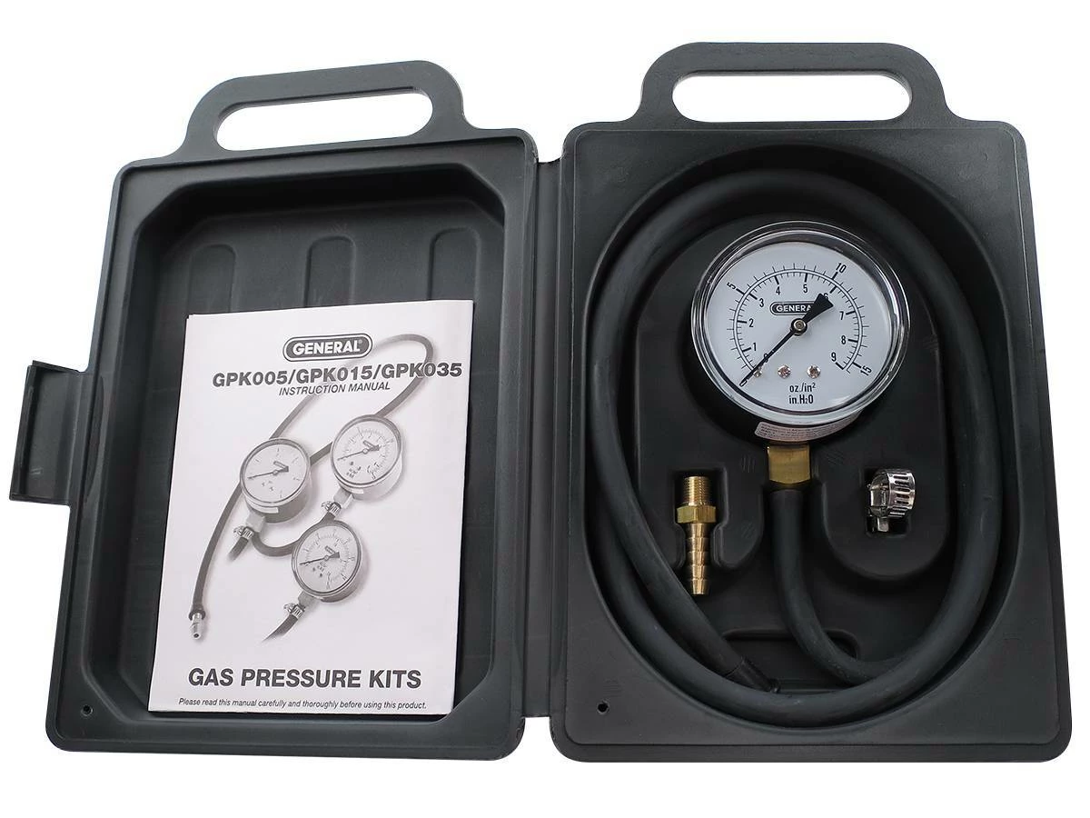 The #GPK005 Gas Pressure Test Kit is ruggedized for field use and easier to use than a manometer. Its diaphragm gauge is calibrated in psi and meets the requirements of the New York City Fuel Gas Code (2008).