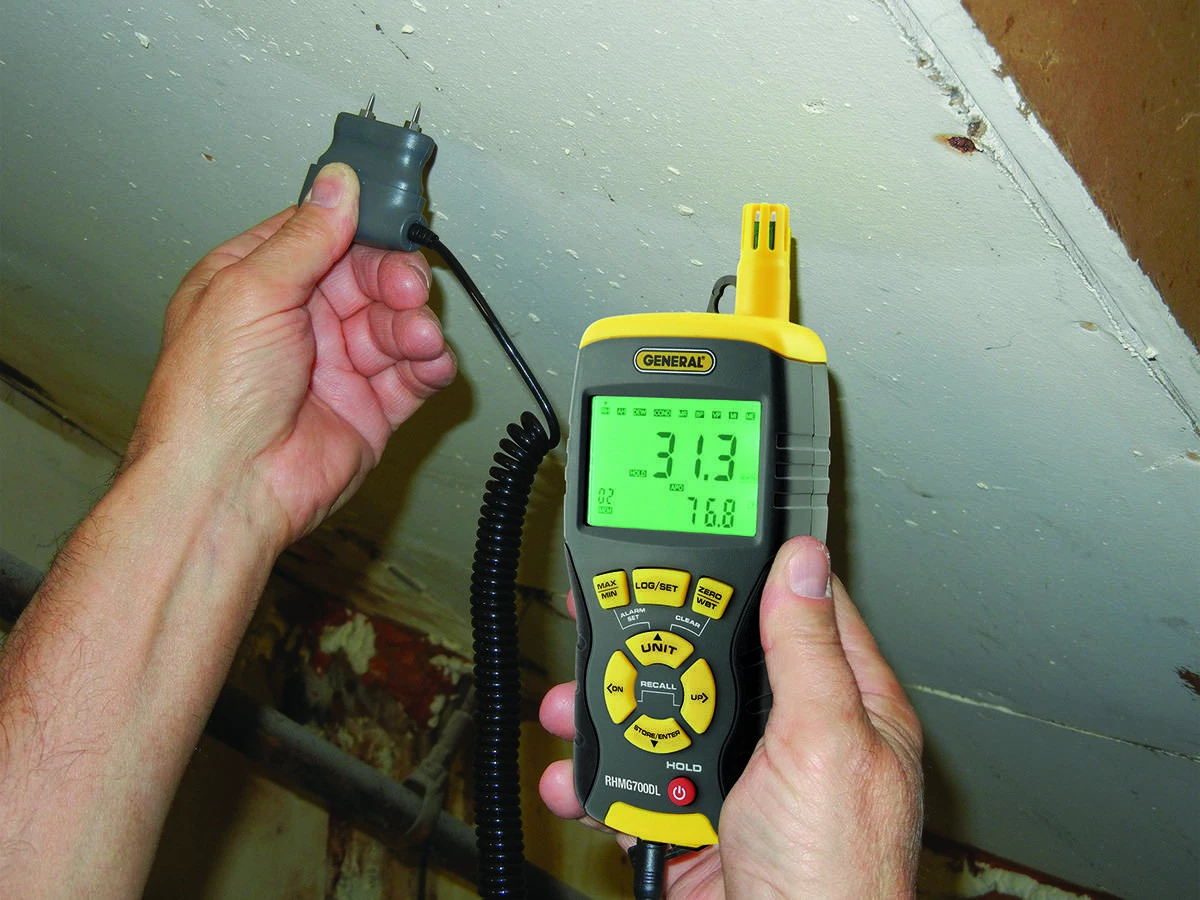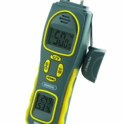 - Measures 1) ambient temperature, 2) relative humidity (RH), 3) absolute humidity (in mg/L or g/m3), 4) GPP (mixing ratio—in grains per pound or g/kg), 5) relative moisture level using the pinless sensor, 6) absolute moisture level using t