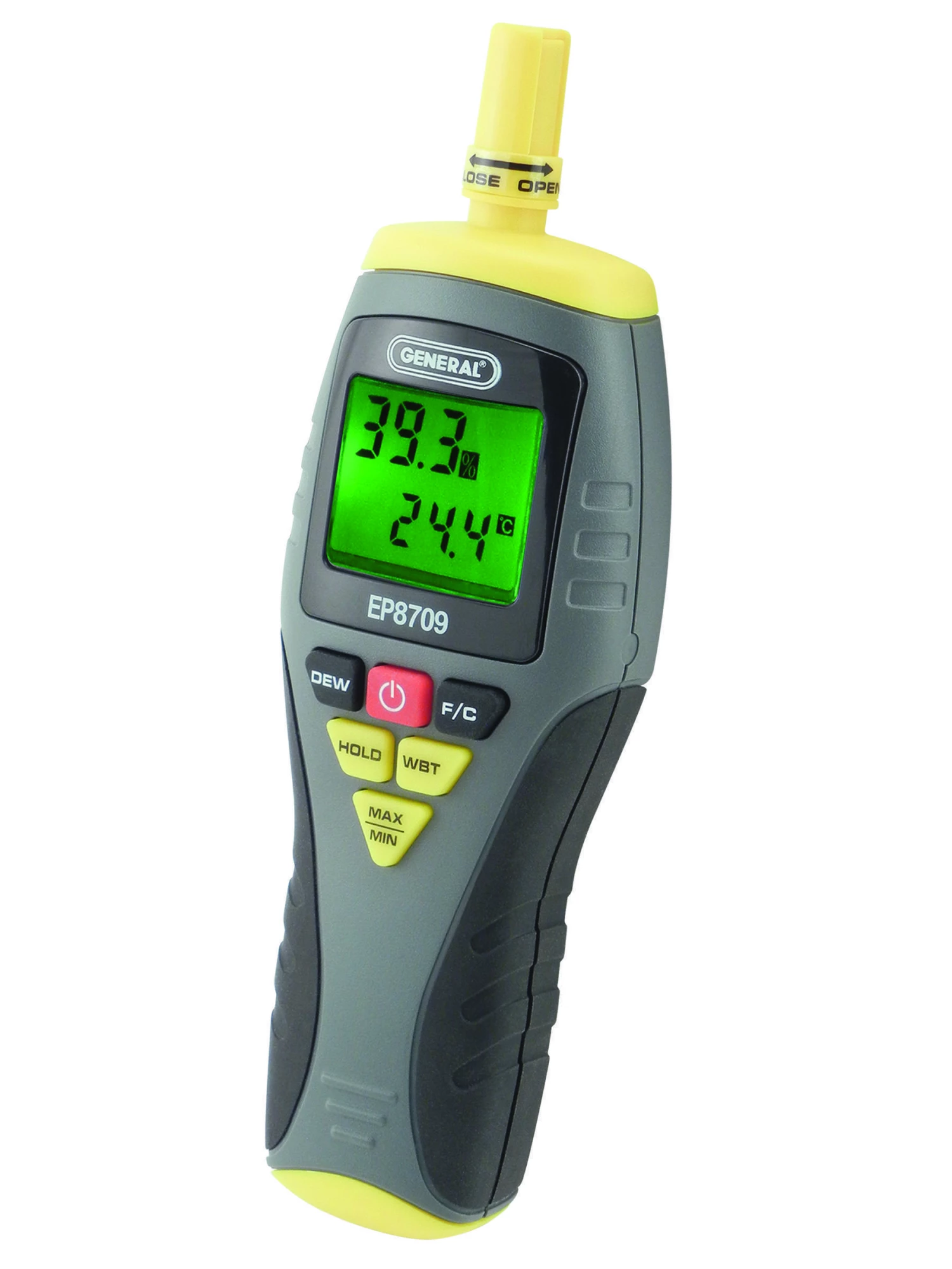 - Displays the relative humidity (RH) above the ambient, dew point or wet bulb temperature on a backlit dual-readout LCD