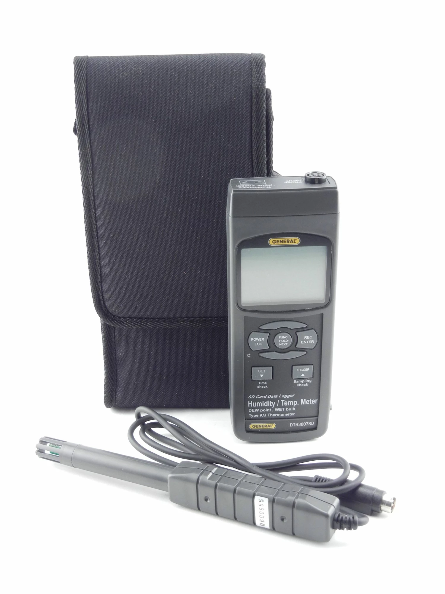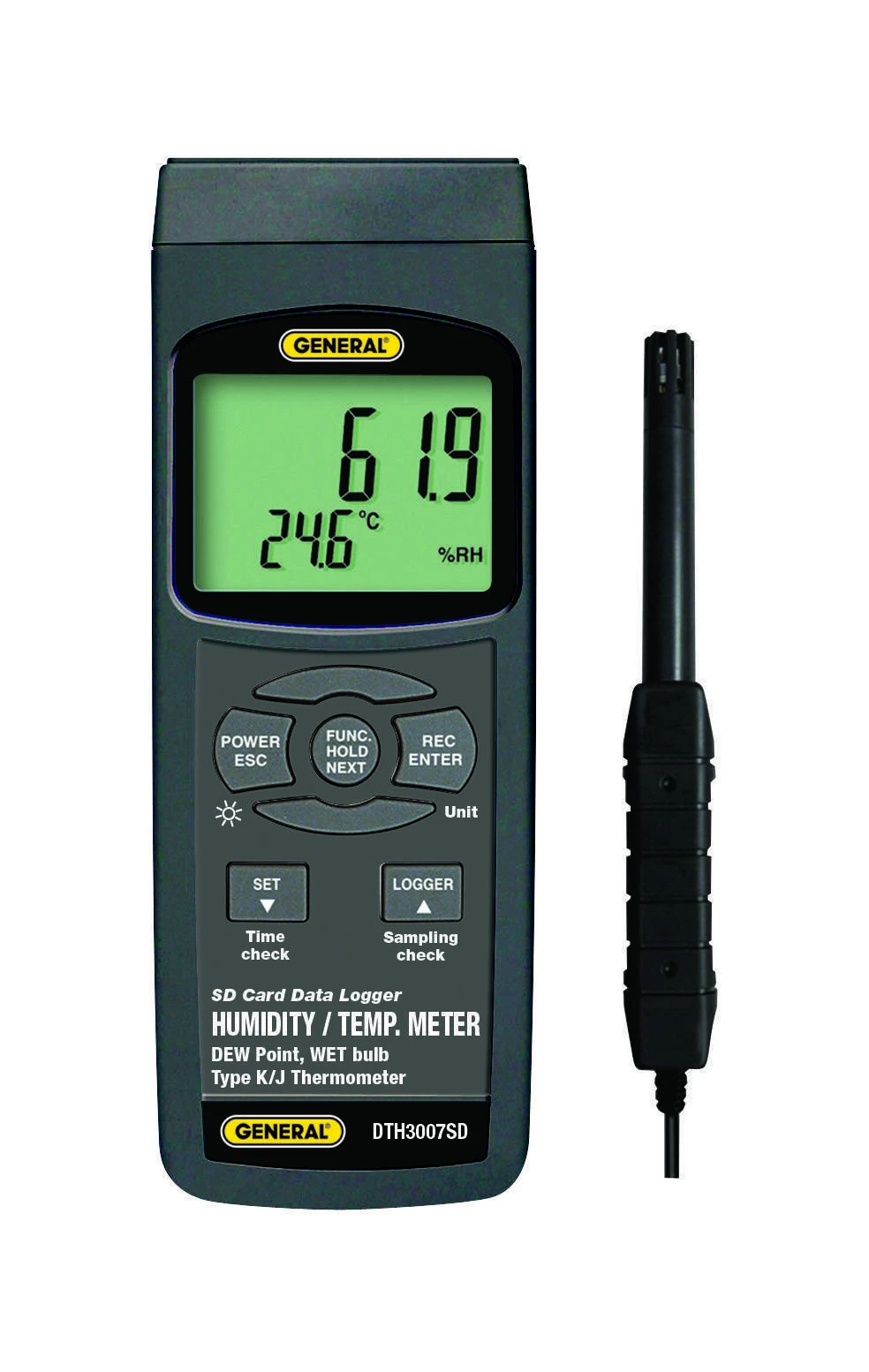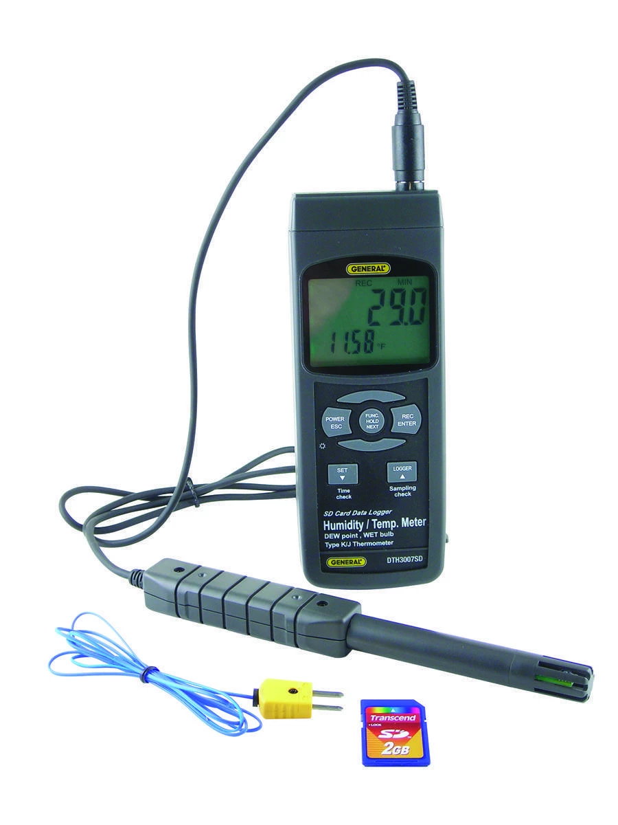 The #DTH3007SD is ideal for tracking and logging the temperature and/or relative humidity of any fluid—including the dew point and wet-bulb temperature of ambient air. The instrument can also measure and log surface temperatures using a Type “K” or “J” thermocouple probe.