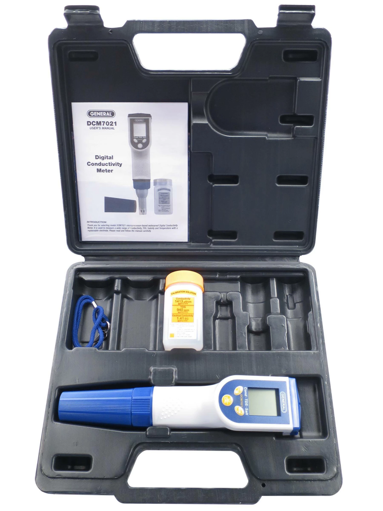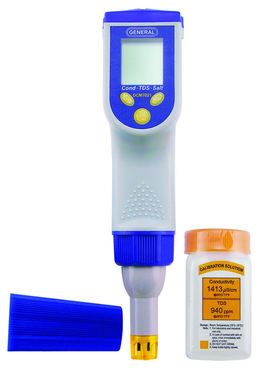 - Measures and displays conductivity, total dissolved solids (TDS) and salt concentrations, and ambient temperature