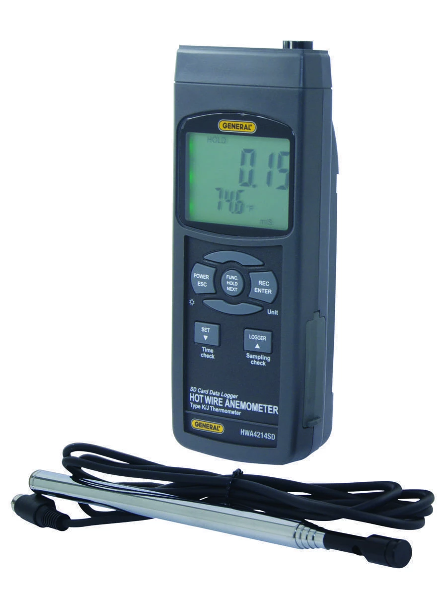 The #HWA4214SD anemometer-thermometer can measure and log the output of exhaust fans and blowers. The hot wire sensor at the end of its telescoping probe can detect breezes as gentle as 40 ft./min (0.2 m/sec), making it ideal for low-airflow applications.