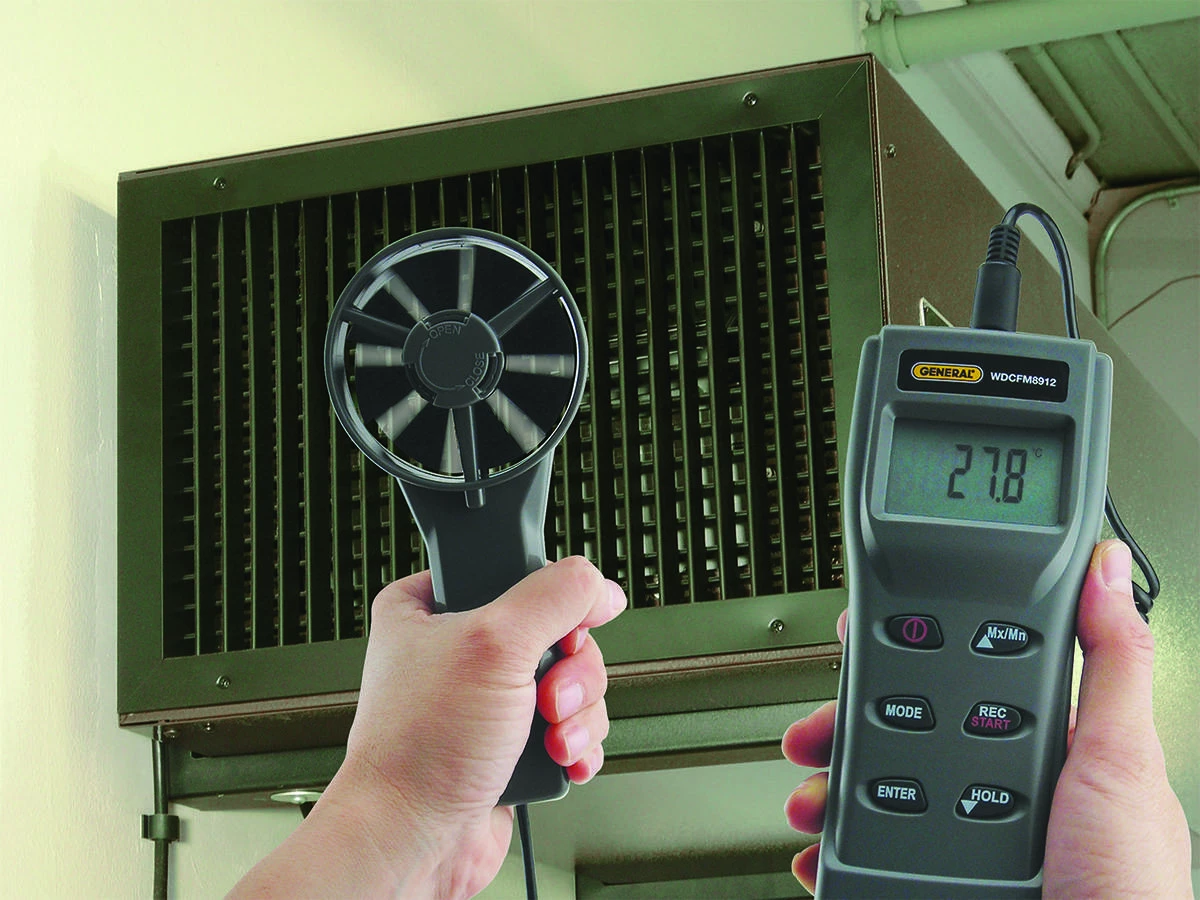 The #WDCFM8912 airflow volume anemometer is designed to measure the output of exhaust fans and blowers. Its vane-style probe can detect air moving as slowly as 60 ft./min (0.3 m/sec). The meter also measures or calculates airflow volume, relative humidity, and ambient, Dew Point and Wet Bulb temperatures.