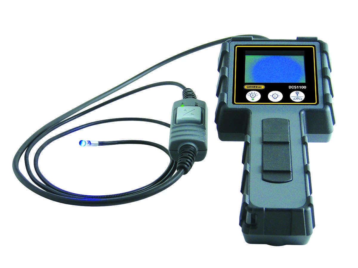The #DCS1100 Video Inspection Camera/Borescope with Thin Front/Side View Probe is a non-recording unit that includes the super-slim (4.9mm/0.19 in. diameter) #P1618FS-49 probe with two cameras. A button on the probe enables the user to toggle between front and side views in a narrow space. Applications include: Inspecting cylinders, valves, diesel injectors, and glow port plugs; looking behind body panels and under the dashboard to optimize cable routing; checking for corrosion and wear in hard-to-see areas; and inspecting fluid lines for leaks.